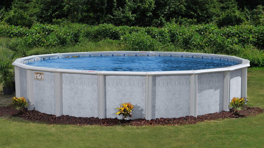 The Summerville Pool - A stylish wall pattern with a rugged silvertone frame makes a sturdy pool that's fun and fits in any backyard.